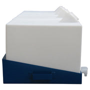 15 gallon capacity Rack Tanks feature a sloped bottom for efficient gravity feed dispense. The 15 gallon tanks are manufactured from UL Rated food-grade polyethylene with a 2" angled fill port designed for easy fill. The front of each tank has two molded inserts for both placard insertion for labeling fluids and to secure the standard aluminum handles. The translucent tanks display interior fluid levels, and come standard with aluminum handles for ergonomic transport and with a 3/4" polyethylene valve.