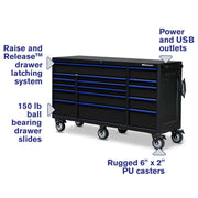 Our new 72 x 20 in. tool cabinet features an exclusive Heavy Duty Raise and Release latching system that keeps drawers tightly closed, while the tubular lock keeps your valuables protected. Full extension ball bearing drawer slides hold up to 150 lb., increasing capacity over comparable tool cabinets and providing a smooth pull action. Power and USB outlets on one side make it quick and easy to charge your power tools and mobile devices. Rugged casters provide easy mobility while supporting the weight.