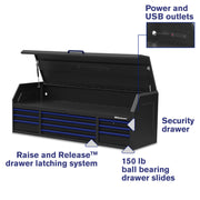 Our new 72 x 24 in. tool chest features an exclusive Heavy Duty Raise and Release latching system that keeps drawers tightly closed, while the tubular locks keep your valuables protected. Full extension ball bearing drawer slides hold up to 150 lb., increasing capacity over comparable tool chests and providing a smooth pull action. Power and USB outlets in the till area make it quick and easy to charge your power tools and mobile devices.