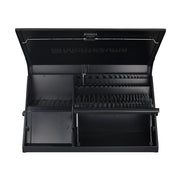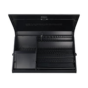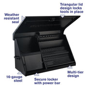 The 41 x 18 inch Steel Triangle® Toolbox allows you to organize more than 280 tools and see them all at a glance with the multi-tier design. When closed, the trademarked lid design locks tools in position, creating protection, security and organization. The personal locker provides a secure, lockable space to store your valuables and also includes a power socket for charging.