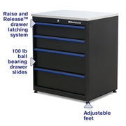 Our 4-drawer base cabinet is 24" deep, providing you with 33% more cubic space than a standard 18" deep garage storage unit. The exclusive Raise and Release latching system keeps drawers tightly closed, while the tubular lock keeps your valuables protected. Full extension ball bearing drawer slides hold up to 100 lb., increasing capacity and providing a smooth pull action.