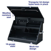 The 30 x 15 in. Steel Triangle™ Toolbox allows you to organize more than 141 tools and see them all at a glance with the multi-tier design. When closed, the trademarked lid design locks tools in position, creating protection, security, and organization.
