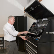 The 36 x 17 in. Steel Triangle® Toolbox allows you to organize more than 280 tools and see them all at a glance with the multi-tier design. When closed, the trademarked lid design locks tools in position, creating protection, security, and organization.