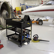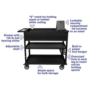 The 40" Mobile Work Cart with Power Tool Holder puts your tools right where you need them and keeps you organized. This innovative work cart pulls right up to your project and puts your tools within easy reach. The power center provides power for charging and the hanging tool rack holds your battery powered tools. There is a lockable privacy compartment for holding your valuables. The hinged compartment cover can be folded into an easel to hold a tablet or paperwork.